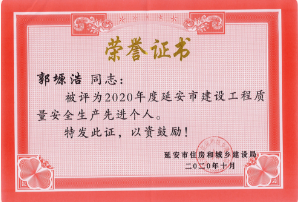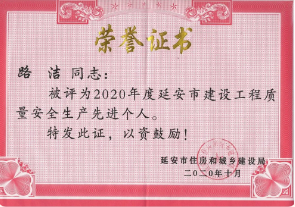 路潔、郭塬浩榮獲“延安市建設(shè)工程質(zhì)量安全生產(chǎn)先進(jìn)個人”榮譽(yù)稱號。
