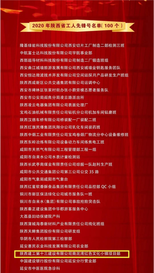 近日,陜西省三秦工匠、五一勞動(dòng)獎(jiǎng)表彰大會(huì)在西安隆重舉行,會(huì)議表彰了2020年三秦工匠 和陜西省五一勞動(dòng)獎(jiǎng)、工人先鋒號(hào)。陜西建工第十三建設(shè)有限公司南泥灣紅色文化小鎮(zhèn)項(xiàng)目部榮獲2020年“陜西省工人先鋒號(hào)”榮譽(yù)稱號(hào)。
