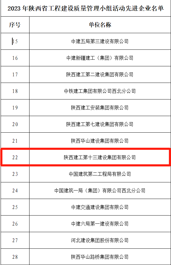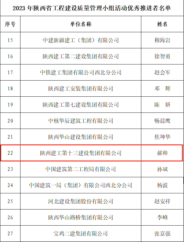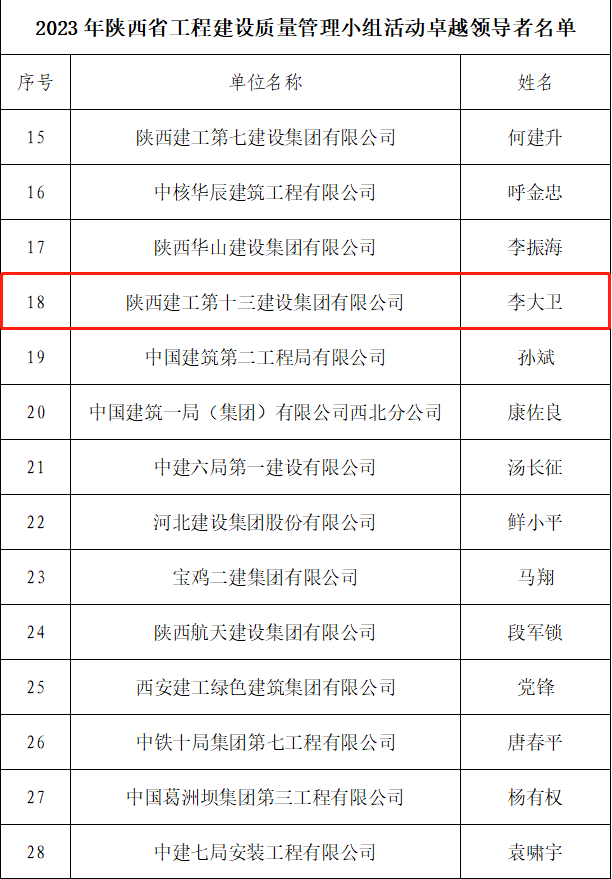 此外,陜西建工第十三建設(shè)集團有限公司被評為“2023年陜西省工程建設(shè)質(zhì)量管理小組活動先進企業(yè)”;集團副總工程師、科技質(zhì)量部部長李大衛(wèi)被評為“2023年陜西省工程建設(shè)質(zhì)量管理小組活動卓越領(lǐng)導(dǎo)者”;郝帥被評為“2023年陜西省工程建設(shè)質(zhì)量管理小組活動優(yōu)秀推進者”。