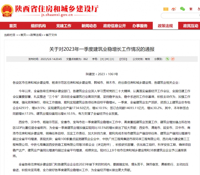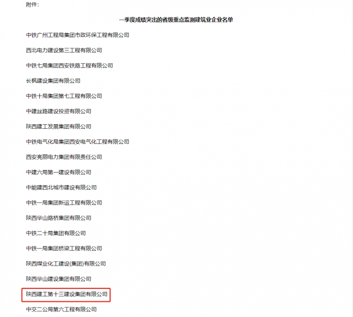 近日,陜西省住建廳通報(bào)了2023年一季度建筑業(yè)穩(wěn)增長工作情況。陜西建工第十三建設(shè)集團(tuán)有限公司等38家建筑業(yè)企業(yè)受表揚(yáng),被評為一季度成績突出的省級(jí)重點(diǎn)監(jiān)測建筑業(yè)企業(yè)。
